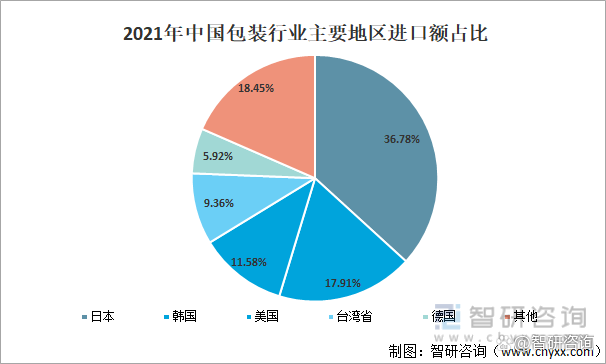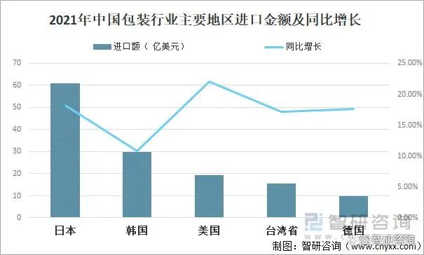 其中2021年中国包装行业日本完成累计进口额61.08亿美元,同比增长18.23%;韩国完成累计进口额29.73亿美元,同比增长10.85%;美国完成累计进口额19.23亿美元,同比增长22.03%;台湾省完成累计进口额15.55亿美元,同比增长17.12%;德国完成累计进口额9.83亿美元,同比增长17.6%。
