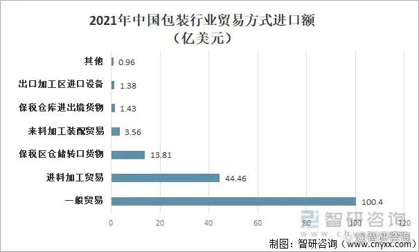 其中,2021年中国包装行业一般贸易完成累计进口额100.4亿美元;进料加工贸易完成累计进口额44.46亿美元;保税区仓储转口货物完成累计进口额13.81亿美元;来料加工装配贸易完成累计进口额3.56亿美元;保税仓库进出境货物完成累计进口额1.43亿美元;出口加工区进口设备完成累计进口额1.38亿美元;其他完成累计进口额0.96亿美元;外商投资企业作为投资进口的设备、物品完成累计进口额0.01亿美元。