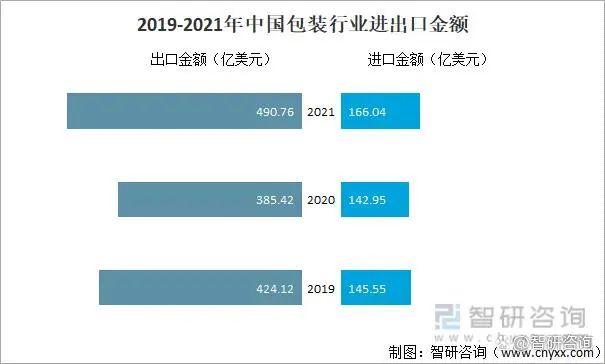 其中,2021年中国包装行业累计出口额490.76亿美元,同比增长27.33%。累计进口额166.04亿美元,同比增长16.15%。行业对外贸易保持较大顺差。