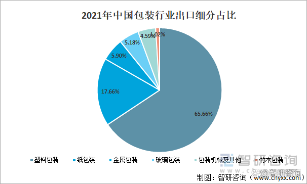 2021年1-12月,中国包装行业完成累计出口额490.76亿美元,同比增长27.33%。其中,塑料包装完成累计出口额占65.66%;纸包装完成累计出口额占17.66%,金属包装完成累计出口额占5.9%;玻璃包装完成累计出口额占5.18%,包装机械及其他完成累计出口额占4.59%;竹木包装完成累计出口额占1.02%。