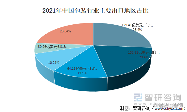 2021年1-12月,中国包装行业完成累计出口额490.76亿美元,同比增长27.33%。按收发货人注册地出口额排在前五位的地区依次是广东、浙江、江苏、山东、上海。其中:广东完成累计出口额129.41亿美元(占26.37%);浙江完成累计出口额100.11 亿美元(占20.4%);江苏完成累计出口额64.13亿美元(占13.07%);山东完成累计出口额50.11亿美元(占10.21%);上海完成累计出口额30.96亿美元(占6.31%)。