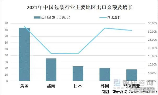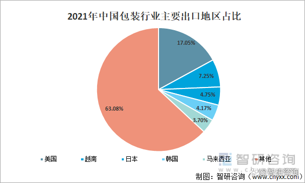 2021年1-12月,全国包装行业完成累计出口额490.76亿美元,同比增长27.33%。出口额排在前五位的国家依次是美国、越南、日本、韩国、马来西亚。其中:美国完成累计出口额占比17.05%;越南完成累计出口额比占7.25%;日本完成累计出口额占4.75%;韩国完成累计出口额占4.17%,马来西亚完成累计出口额占3.7%。