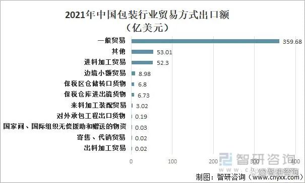 2021年1-12月,中国包装行业完成累计出口额490.76亿美元,同比增长27.33%。其中,一般贸易完成累计出口额359.68亿美元,同比增长28.98%;其他完成累计出口额53.01亿美元,同比增长 41.52%;进料加工贸易完成累计出口额52.3亿美元,同比增长13.03%;边境小额贸易完成累计出口额8.98亿美元,同比增长2.47%;保税区仓储转口货物完成累计出口额6.8亿美元,同比增长30.31%;保税仓库进出境货物完成累计出口额6.73亿美元,同比增长19.46%;来料加工装配贸易完成累计出口额3.02亿美元,同比增长-0.95%;对外承包工程出口货物完成累计出口额0.19亿美元,同比增长71.21%;国家间、国际组织无偿援助和赠送的物资完成累计出口额0.03亿美元,同比增长-46.99%;出料加工贸易完成累计出口额0.02亿美元,同比增长325.94%;寄售、代销贸易完成累计出口额0.02亿美元,同比增长554.88%。