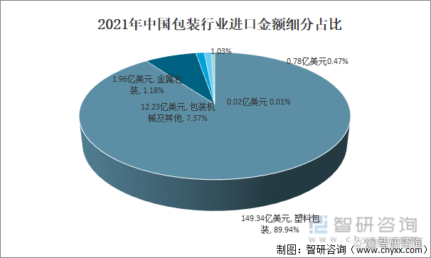 2021年1-12月,中国包装行业完成累计进口额166.04亿美元,同比增长16.15%。其中,塑料包装完成累计进口额149.34亿美元,占总进口金额的89.94%;包装机械及其他完成累计进口额12.23亿美元,占总进口金额的 7.37%;金属包装完成累计进口额1.96亿美元,占总进口金额的1.18%,纸包装完成累计进口额1.71亿美元,占总进口金额的1.03%,玻璃包装完成累计进口额0.78亿美元,占总进口金额的0.47%,竹木包装完成累计进口额0.02亿美,占总进口金额的0.01%。
