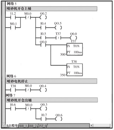 设备自动运行是设计控制系统的目的之一。当检测到喷砂室有桶信号后,仓门气缸关闭、喷砂室扬起,启动电机对钢桶进行喷砂打磨,打磨完成后开仓出桶。如图3所示为部分自动喷砂程序。