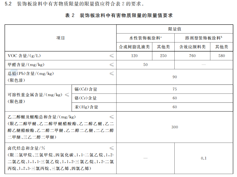 新标准指标项在GB 18582-2008及GB 24408-2009基础上,除了水性墙面涂料外,特别增加了装饰板涂料这个新产品分类项目和指标。在水性墙面涂料方面,其中“水性墙面涂料”改为“内墙涂料”,“水性墙面腻子”改为“腻子”,“游离甲醛”改为“甲醛含量”,“苯、甲苯、乙苯、二甲苯总和”改为“苯系物总和含量”;修改了“VOC含量”“甲醛含量”“苯系物总和含量”项目的指标;删除了“可溶性重金属”中“铅Pb”项目及指标;增加了“总铅(Pb)含量”“烷基酚聚氧乙烯醚总和含量”项目及指标;增加了“外墙涂料”及其项目和指标。