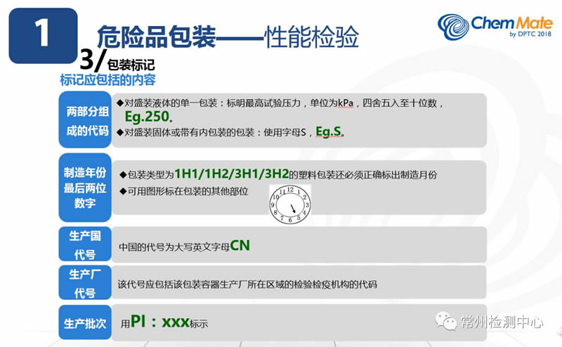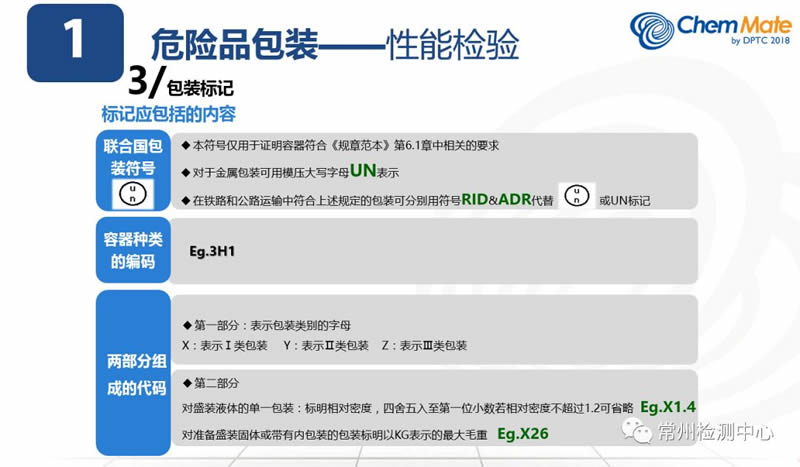 我们最终包装的性能检验是以包装的检验报告。包装经过性能检测以后,最终体现在这个包装容器本身的就是我们看到的包装UN标记。我们现在包括从事货代,包括运输,包装的使用企业,特别是包装的生产企业,对这个UN标记都不是很理解。但是只有认识了包装标记每一部分表示的含义以后,你对包装的使用才有一个认识的前提,所以要着重强调一下包装标记。