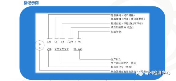 第四部分是一个液压试验的压力250kPa,这个就是我们性能检验里面最后一个液压试验。第五部分是包装生产的年份、国别以及包装生产企业的检验检疫机构代码和生产批次。比如我举个钢桶为例,那桶上面,危险品包装和普通包装唯一的区别在什么?就是在这个标记,危险品包装通过了实验以后,它会打上这个刚印,那么就看到了UAEAX.6,对吧?250,D2CA,然后中国321607,一着就是这个检验检疫机构代码以及生产批次。那么这里给大家讲一下就是刚才上面的这个是小写的UN加圆圈,UN TDG里面有一个规定,就是凡是金属包装容器,可以用大写的UN模压,就是用钢印来代替这个小小的UN圆圈这个符号,那么换句话说,就是刚才讲的上面一个,这个符号是通用的,就是所有的危险品包装都可以用,唯独金属容器可以用大写的UN代替,这里大家注意的,就是代替的意思,就是金属容器,也可以用刚才那个圆圈UN符号。这个好多人不理解。