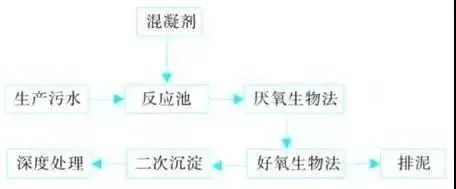 后续处理工艺流程如下:生产废水→絮凝沉淀→废水调节池→厌氧池→兼氧池→接触氧化池→MBR膜池→臭氧氧化池→排放。
