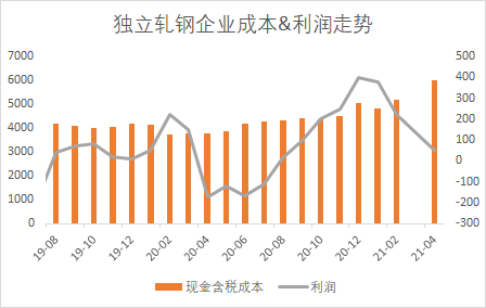 根据Mysteel对个别独立轧钢企业的成本跟踪显示,4月份虽然冷热价差收缩至300元以内,热卷结算成本整体上移,因此对于独立轧钢企业来说,5月份利润继续收窄至盈亏边缘线。