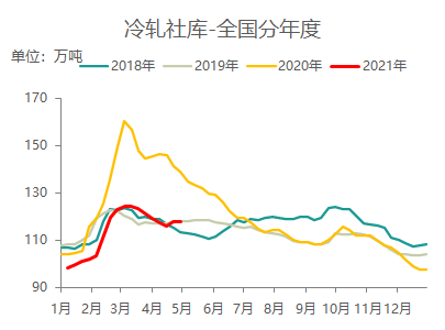 社会库存方面:截至4月29日本网监测26个城市库存,本周冷轧板卷社会库存117.88,周环比减少0.14,月环比减少1.32,年同比减少21.00。(单位:万吨)