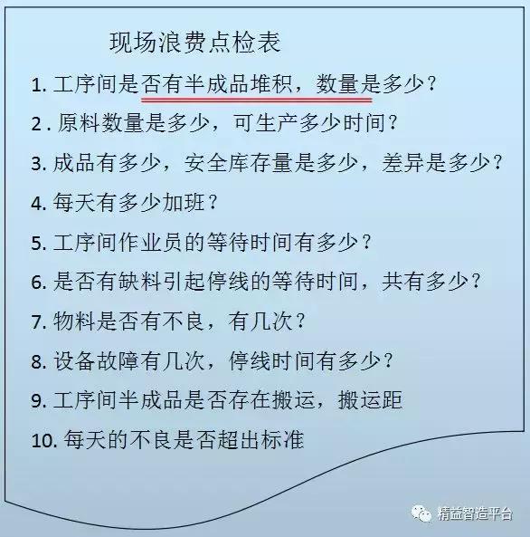 制作七大浪费的点检表,定期对现场进行点检,找出浪费最大的五项进行改善。