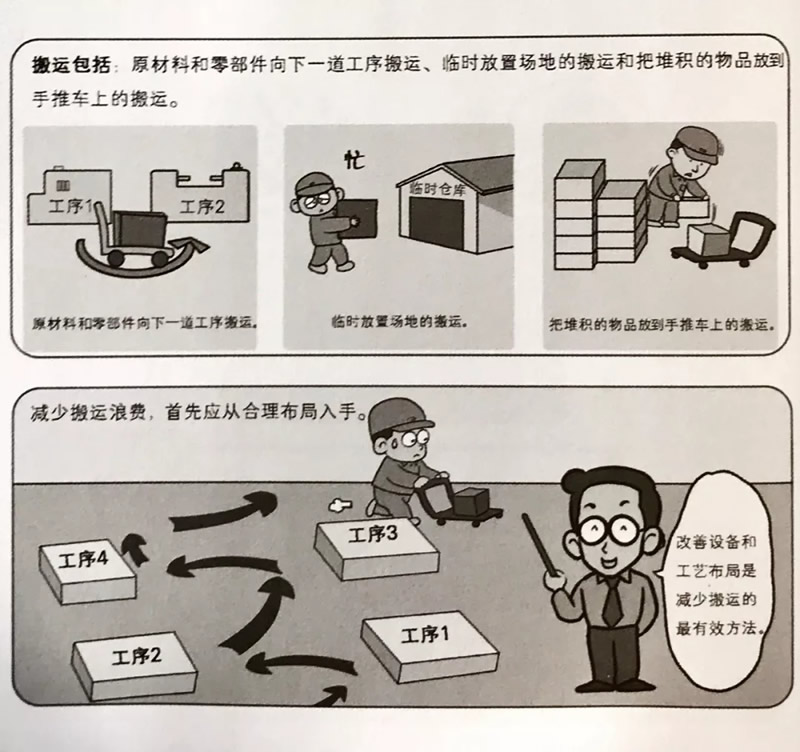 搬运动作遍及生产活动中的各个流程,包含放置、堆积、移动、整理等动作,但是搬运并不能产生附加价值,所以它本身就被认为是一种浪费。搬运包括原材料和零部件向下-道工序搬运、临时放置场地的搬运和把堆积的物品放到手推车上的搬运。其中,设备布局不合理、生产线布局不合理、工序流程不合理等是造成搬运浪费的主要因素。因此,要想消除搬运浪费,首先应从合理布局入手,尽可能减少搬运。