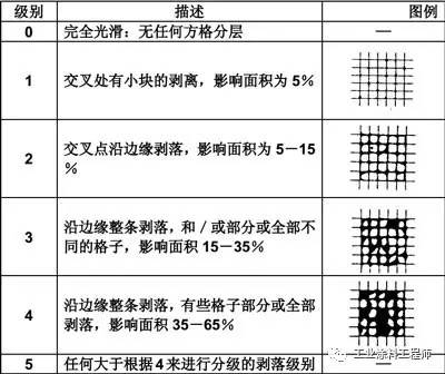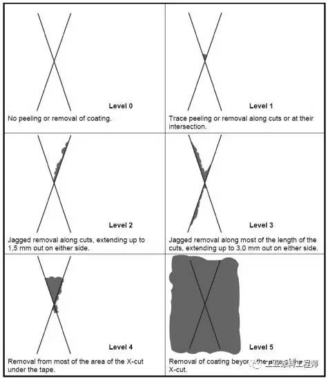 请注意:ISO16276-2和ASTM D 3359中对结果的评级是相反的。即5A=Level0;4A=Level1;3A=Level2;2A=Level3;1A=Level4;0A=Level5。