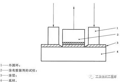(4) 用胶带把试柱固定在涂层表面,双组份环氧胶粘剂在室温下要固化24小时;氰基丙烯酸胶粘剂按说明书的要求(15分钟后达到强度,最好在2小时测试);