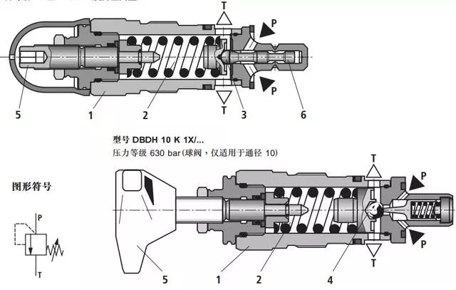 压力油经阻尼孔进入阀芯底部,当作用在阀芯上的作用力大于弹簧力时,阀口打开,使油液溢流。通过转动手轮可以调节弹簧预紧力,从而调节溢流阀的开启压力,通过更换不同刚度的弹簧可以调整溢流阀的调压范围。直动式溢流阀结构简单,灵敏度高,但不适于在高压大流量的场合。下图为力士乐DBD型溢流阀的剖面图,原理与上图相同,详情请参考力士乐样本。