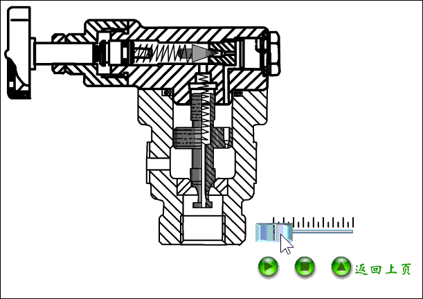 直动式溢流阀有锥阀式、球阀式、滑阀式三种结构。下图为滑阀式结构的直动式溢流阀的工作原理。