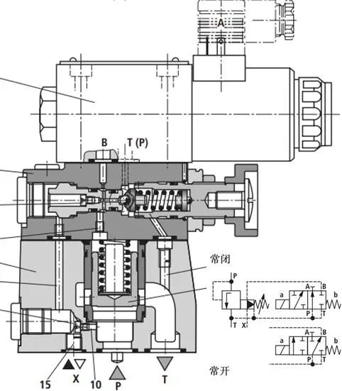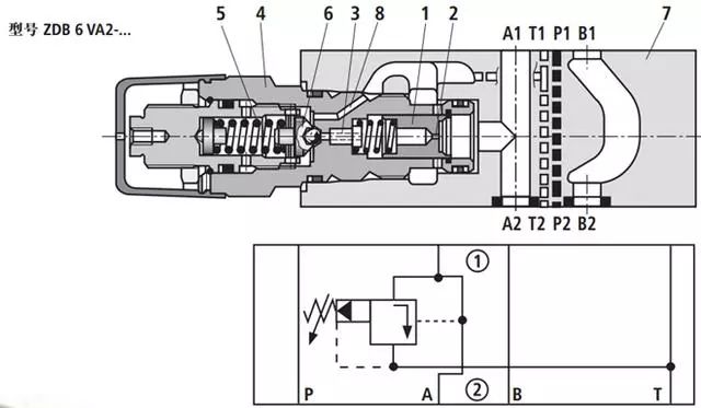 下图为力士乐DBW型电磁溢流阀及其符号。