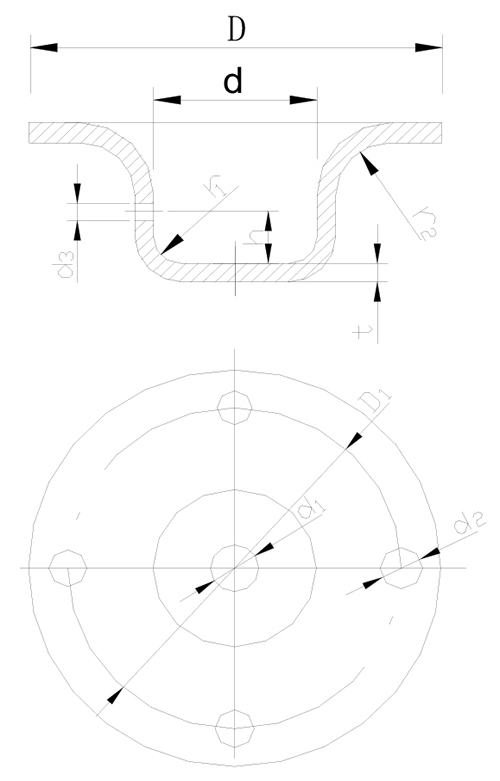 如下图所示,拉伸件底部与直壁之间的圆角半径应大于板厚,即r1≥t 。为了使拉伸进行得更顺利,一般取r1=(3~5)t,最大圆角半径应小于或等于板厚的8倍,即r1≤8t。
