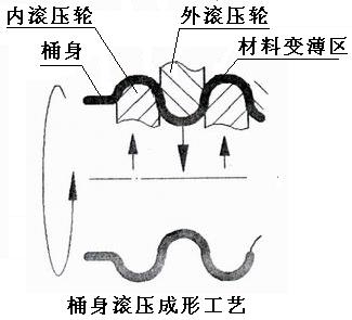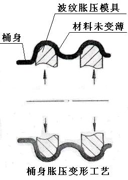 薄壁桶身的材料强度较弱,加工中应注意加以保护。桶身的环筋和波纹应采用胀压加工工艺,而不应沿用传统的滚压加工工艺。这是由于滚压工艺在桶身的变形局部使材料变薄,破坏了一定的材料强度,而胀压工艺则保持了材料原有的强度不变(见附图)。