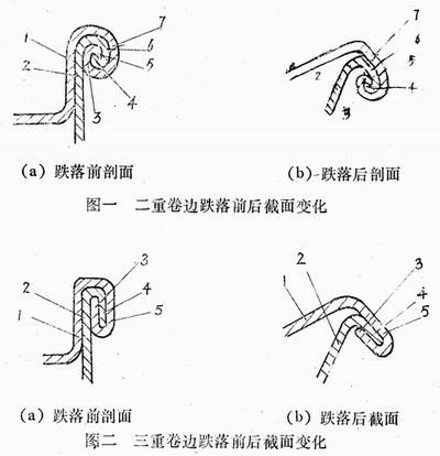 盛装98%水的钢桶从1.2米以上高度跌落时,由于受重力加速度的作用,撞击到地面时,桶对地面产生数吨的冲击力,地面又以大小相等方向相反的力作用在桶卷边上,使卷边部分被破坏,图一为二重卷边钢桶跌落前后卷边剖面图,图二为三重卷边钢桶跌落前后卷边削面图。