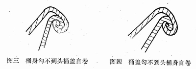三重卷边钢桶偶尔产生渗漏的原因,笔者认为有三个可能性:一桶身料在卷封中勾不到头,桶底盖自卷如图三所示;二桶底盖料勾不到头,桶身料自卷如图四所示;三局部填料不充足,无法填满缝隙。产生卷边较大缝隙的原因是桶身板不均一头宽一头窄,另一个原因桶底盖凸缘边一边窄,一边宽或有局部缺口。近年来,笔者曾组织人员进行了100个钢桶的跌落试验,其中二重卷边桶占70%,三重卷边占30%。其结果,二重卷边几乎个个渗漏,而三重卷边几乎个个不渗漏,有些二重卷边桶1米高跌落也要渗漏,甚至尚未凿洞就已渗漏,而三重卷边桶高度在2米以上跌落也不渗漏。