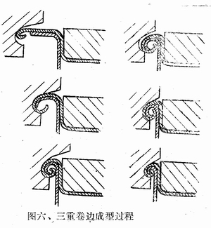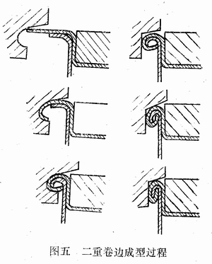 从二重卷边和三重卷边形成过程的分析,我们可以看出,三重卷边和二重卷边其形成过程并没有根本上的差异。最大的不同在于三重卷边其桶底盖最好先预卷,桶身扳边尺寸和桶底盖凸缘要求宽些,另外要求第二道卷封轮成型曲线要能包容七层卷边(即工作而展开长度大些)。