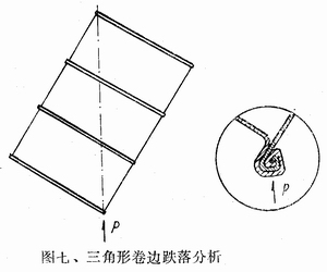 三重卷边桶底盖预弯一般在专用的预卷机上进行。在预弯的同时还要施胶,并在离心力作用下使填料聚集在预弯边缘处。为了保证卷边质量要确保填料干透才进行卷封。由于桶底盖经过预弯,因此三重卷边第一道卷封轮工作面曲线形状可以和二重卷边第一道卷封轮设计得较接近。即要求卷封进给量大,卷封轮工作面槽形狄窄而且较深。笔者曾试用二重卷边第一道卷封轮来代替三重卷边第一道卷封轮,其效果并不很差。第二道卷封轮主要起继续滚挤压,使其成为严密卷封接缝,其工作面宽而浅。卷边形状还可以根据不同厂家要求和特色来选择。一般很少采用三重矩形卷边,以采用圆卷边形式最多,有的厂采用三角形卷边。由于卷边呈三角形,卷边局部冷作硬化,在受外力冲击时不易被冲开。由于三角形卷边在进行对角线跌落,时撞击面正好是平面,如图七所示,有越受冲击越紧的可能性,因此跌落性能甚好。但是这种卷边最大缺点是水压试验承受压力偏小些,一般不超过3Kgf/cm2 (29.419×104Pa),而其他卷边形式往往可以承受4Kgf/cm2(39.226×104Pa)压力而不渗漏。尽管如此,三角形卷边仍然满足《国际海运危规》I类要求。