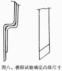 三重卷边技术的关键是其卷封轮工作面曲线的设计,以及桶身和桶底盖凸缘尺寸等参数的确定。而这些均可以通过模拟试验来确定。进行模拟试验,一方面可以少走弯路,二方面又可以大幅度减少材料损失。试验时,可以用铝带或钢带来代替桶底盖和桶身凸缘,如图八所示。用压轮代替卷封轮,压轮曲线形状可以参照二重卷边卷封轮曲线形状,但压轮制成车床的车刀形状而不是“轮形”。可以用虎钳夹紧铝带或钢带,用钻床钻夹头或刨床JJ架夹紧压轮,用手轮实现进给,在进给过程中可以目测“卷边”形成过程,经过反复试验,不断改进即可较顺利地确定较理想的卷边卷轮曲线形状和桶身与桶底盖凸缘尺寸。同样,桶底盖预卷轮工作面曲线,也可以用类似办法来确定。