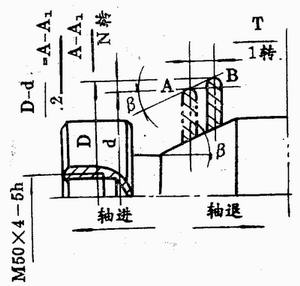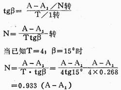 式中,N-胀轴转数。当N为正值时, 胀轴作调进转动,当N为负值时,胀轴作退出转动多单位为转;T-胀轴调节螺母的导程或牙距(mm/转);β-胀轴与胀块配合斜角(即锥角之半)(度);:A、A′-分别表示要求筋高和实测筋高(mm)。