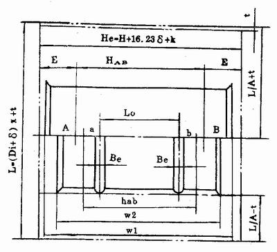 2.桶身展开板宽的计算 桶身板展开宽依钢桶外高,卷边卷绕长度、胀筋、滚轧波纹缩短总量确定的。可按下列步骤进行计算。如图1所示, 已知H,求He