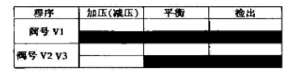 a. 测定回路。检测原理如图1所示,不泄露的标准容器与被测容器加上相同的气压,将阀门V2、V3关闭,将空气封存在里面,被测容器的泄露会被在加两容器之间的微差压传感器所测得。阀门V1、V2、V3加压(减压)、平衡、检出的时间表,如图2所示。