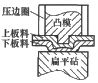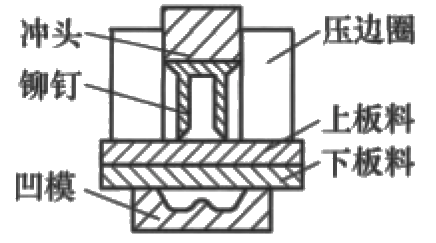 无模自冲铆接是不需要凹模的无铆钉铆接。无模自冲铆接的原理是:上、下板料重叠放在扁平砧上,压边圈和凸模都向下移动,压边圈把一定压力加在上、下板料上。然后凸模在高压力下压入上、下板料,板料底侧向上升起形成凹起。当凸模更进一步压入板料时,由于底部扁平,被凸模从代替的材料径向流动,从而形成互锁连接,如图7所示。相对无铆钉自冲铆接,无模自冲铆接设备精度要求不高,装配时间少,且模具不易损坏,减少模具费用。但无模铆冲连接所需要的连接力要比无铆钉自冲铆接高,且铆接时的噪声也大。