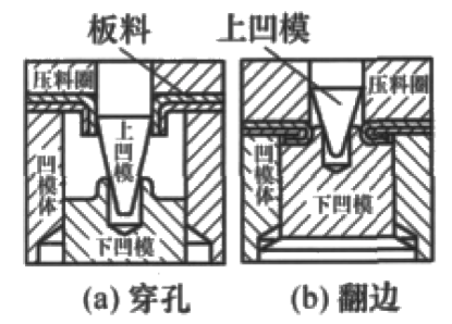 薄钢板自身铆接是无铆钉铆接的方法之一,也是国内研究较早的铆接技术。穿刺翻孔铆接是将压料圈压紧板料,然后用圆锥形上凸模穿刺翻孔,接着撤掉对上凸模压力,使上凸模向上移动,最后使下凸模相向上压,使被穿刺翻孔部分受到凸模压力的作用形成翻边而完成铆接,如图5所示。穿刺翻孔铆接与需要铆钉的铆接相比,有着工序少、便于自动化生产等优点。这种铆接可以部分代替在连接两个薄板因焊接引起的问题。但是穿刺翻孔铆接后工件上要留下孔洞,会破坏表面保护层,且只适用于延伸率较大的薄板。