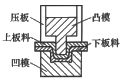 无铆钉自冲铆接是近年来研究较多的无铆钉铆接,其技术也运用于很多的现代化生产。无铆钉自冲铆接是通过凸模的冲压,板料受压弯曲并局部发生塑性变形,同时挤压凹模侧边的材料一起向下流动,在冲压力的作用下逐渐向凹模内凹槽处流动,直至形成冲压铆接点,如图6所示。相对薄钢板自身铆接,无铆钉自冲铆接能实现一定厚度板料的连接,且不破坏板料的保护层。其技术的铆接动态强度较高,易实现自动化,经济性好。但影响冲压铆接强度的因素较多,如板料性质、冲压铆接模具的选型、冲压力选配等。所以确定关键的影响因素,并对之进行优化是进一步发挥冲压铆接技术优越性的关键。