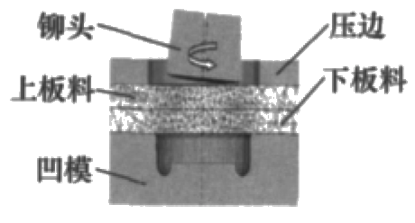 实心铆钉自冲铆接是铆钉铆接方法之一。实心铆钉自冲铆接是把要连接的板料固定在凹模和压边圈之间,通过冲头向下运动将实心铆钉穿透上下层板料,并冲出小块金属,然后在下模的反作用力下,把部分下层板料材料压入环形沟槽,进而形成互锁机构,如图3所示。
