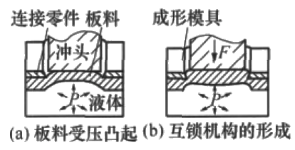 与其它的无铆钉铆接相比,液压铆接可以连接在其他铆接方法难以接近的地方实现板料的连接,便于开发新的设计。液压铆接精度高,效率高。液压铆接的连接原理是:把被连接的零件和液压成形板料固定在液体和液压成形模具之间,对液体加压板料通过孔向上凸起,冲头向下压,由于受到背面高压液体作用材料通过小孔在被连接的零件倒角处形成互锁连接,如图9所示。虽然相对一些无铆钉铆接方法有其突出的优点,但液压铆接对设备的要求较高,设备费用和维修费用较高,而且在实际过程中,上下层板料的比率是形成互锁连接的关键。