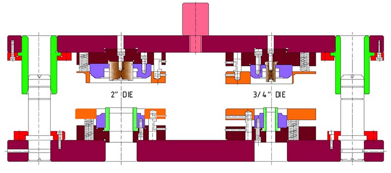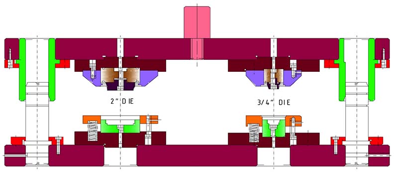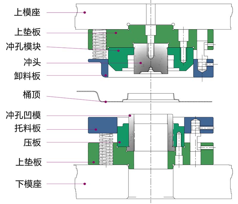 这项工艺技术是将法兰直接进行冲孔锁装的一次性完成的复合模具。只需要一台压力机,这台压力机最少要提供100吨的压力,并具有为专门模具设计的结构和液压系统。压力机可连续冲程运行,以减少离合器的磨损,节省压缩空气的用量。模具结构如图7所示。