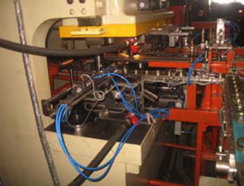 单工序锁装系统是具有世界领先的竞争力,特别是法兰自动送入到模具的指定位置。在冲床上冲头运动时,先将模具冲头锁住,再将冲法兰送入模具内,然后再启 动模具进行冲孔锁装,最后将冲模头弹回模具腔内。这一特点,能够节省劳动力,提高工作效率。这一特点在连续冲压工作中的表现非常出色。该系统的实物如图7、图8和图9所示。