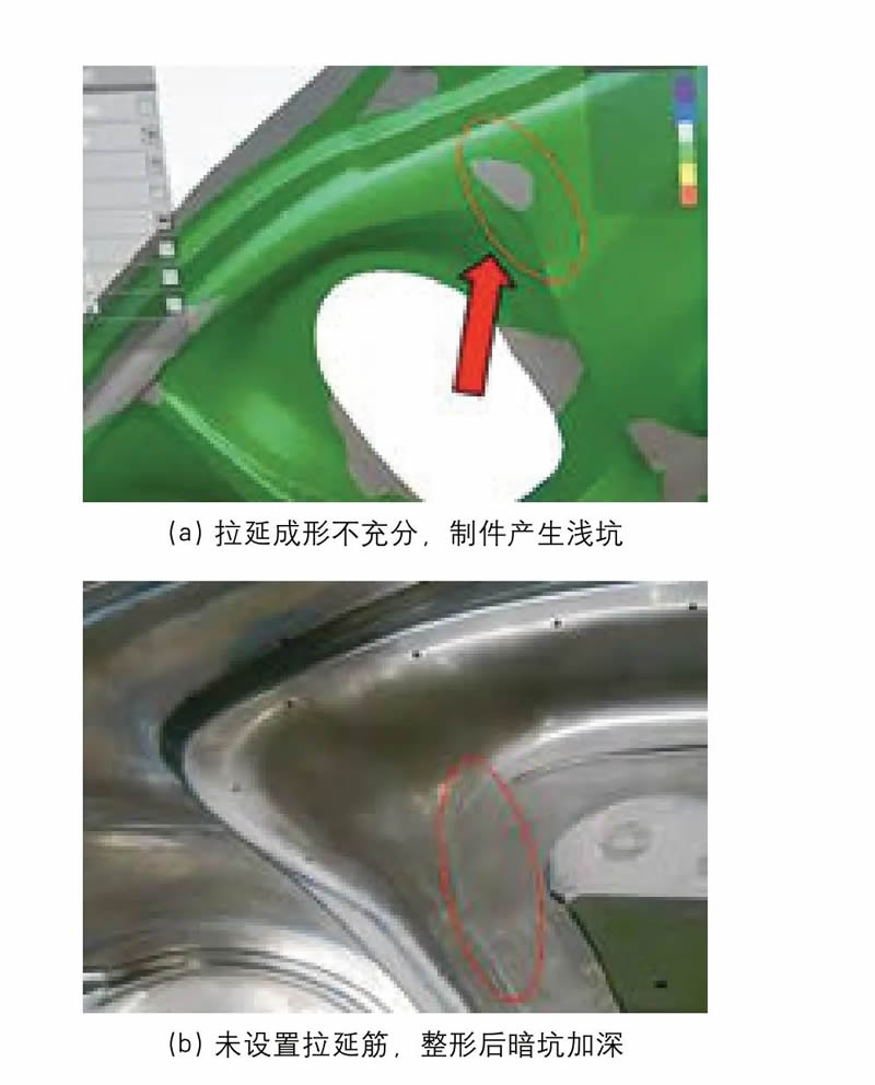 使用AutoForm 模拟软件对拉延成形进行模拟分析发现,该位置在拉延成形时不充分,拉延后制件存在浅坑,见图4(a)。从模具设计上分析,制件缺陷位置未设置拉延筋,见图4(b),单靠压料面无法提供制件成形所需要的阻料力,导致板料塑性变形不充分,后续整形后回弹造成暗坑加深。