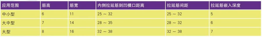 ⑷针对深拉延和成形困难的拉延模,钢板件和铝板件,拉延筋的宽度要求为钢件10mm,铝件12mm,筋高要求为钢件5mm,铝件6mm。拉延筋设计尺寸参数见表1。