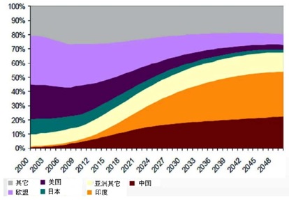 现在90亿人在地球上拥挤地生活着。到2050年,亚洲经济将迎来最大的决定性转变。下图为2000~1050年全球中产阶级的消费份额统计和发展趋势预计。