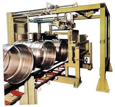 2. 升降器提升起桶盖和底,行走机构移动到生产线上,吸附器把底、盖一个接一个放在特别供料机上。
