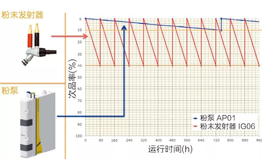 图11 粉末发射器与粉泵的易损件使用时间对比