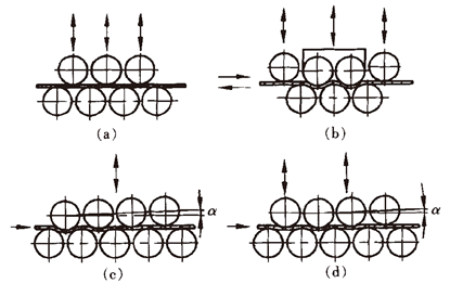 (2)辊列平行式和辊列不平行式辊式板料校平机(图2b)