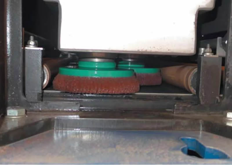 第一个工位是一个研磨砂带磨头,用于去除立式披锋或毛刺以及对划痕等进行表面细化研磨。第二个工位是一个摆动式旋转盘刷组合,用于去除二次毛刺和锐边倒圆,每分钟摆动次数可达120次。第三工位是百洁布研磨带,用于部件表面的最终处理。