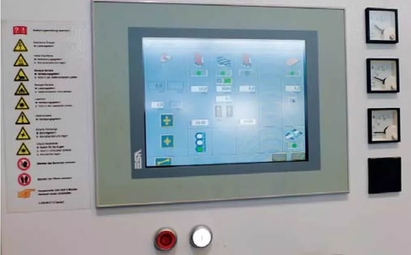 根据具体的加工要求,可以在控制系统里选择合适的程序。需要的时候,可以在10.4寸的显示屏上调取、修改、设定并存储加工程序,如图3所示。涉及的主要参数包括部件的厚度、进给速度、磨头转速以及砂带切削速度等。三个工位的参数是可以分别设定、调整的。砂带的速度可以在每秒2~18m之间进行调节,进给速度可以在每分钟1.2~10m之间进行选择。在这个控制系统里可以存储1024个加工程序。