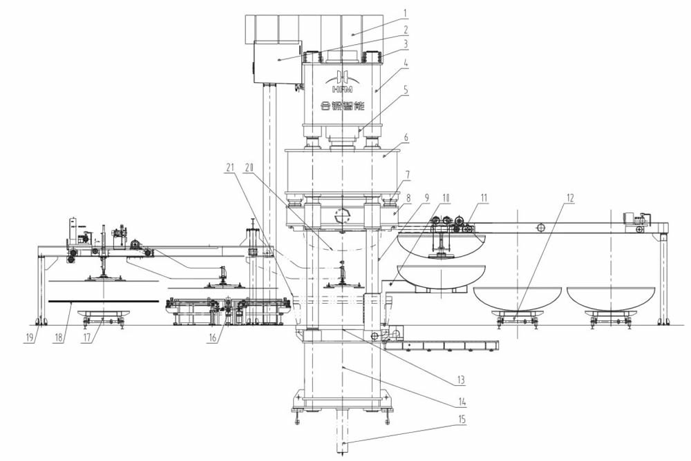 1-保护装置 2-主油箱 3-螺母 4-上横梁 5-拉伸油缸 6-拉伸滑块 7-压边油缸 8-压边滑块 9-立柱 10-旋转装置 11-下料装置12-出料小车 13-移动工作台 14-下横梁 15-顶出旋转装置 16-对中装置 17-送料小车 18-坯料 19-上料装置20-拉伸模具 21-下模具