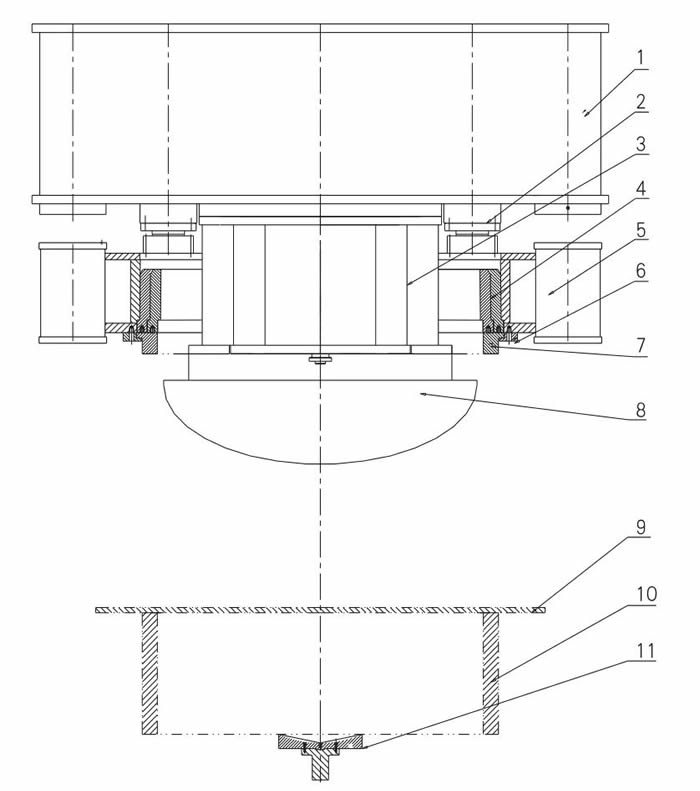 1-拉伸滑块 2-压边缸 3-上模快换装置及接筒 4-模圈5-压边滑块 6-压边圈安装法兰 7-压边圈 8-凸模9-工件 10-凹模 11-顶出旋转装置