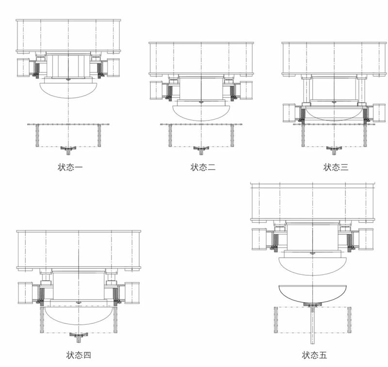 封头拉伸液压机拉伸运动流程图如图4所示,状态一为液压机初始位置,状态二为拉伸滑块和压边滑块在拉伸缸的驱动下一起快速接近工件,状态三为拉伸滑块不动,压边滑块下行压边圈压住工件,状态四为压边滑块不动(有压边力)拉伸滑块下行拉伸工件,状态五为拉伸滑块、压边滑块退回到位,顶起旋转装置顶起工件。其工艺流程为:液压机初始位置→拉伸滑块与压边滑块一起快降→压边滑块单独快降→压边滑块加压→拉伸滑块下行拉伸工件→保压延时及卸压→拉伸滑块压边滑块回程→顶起旋转装置顶起工件→(工件移走后)顶起旋转装置退回。顶起旋转装置顶出起始时间可由滑块的回程中设定的位置激发,以提高工作频次。